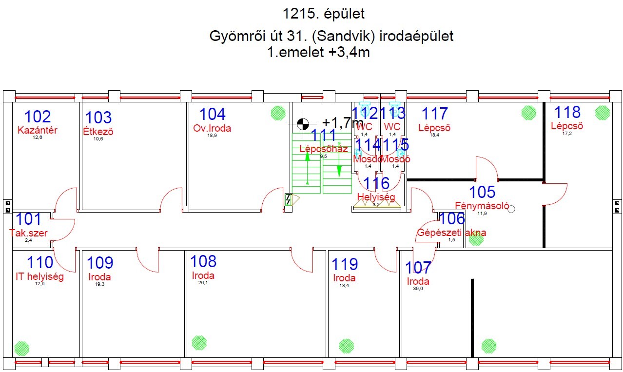 Ez a jó állapotú, C kategóriás irodaépület összesen 552 m² alapterületű, egy tágas, 1335 m²-es telken helyezkedik el. Az egybefüggő, nyitott terek nagy ablakokkal és több irányból érkező természetes fénnyel kellemes, világos munkakörnyezetet biztosítanak.